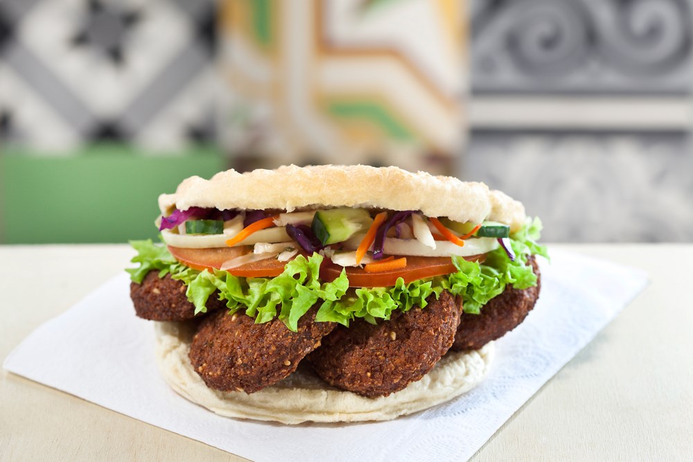 Ingrediënten van een vegetarisch broodje Falafel. Lees verder ..